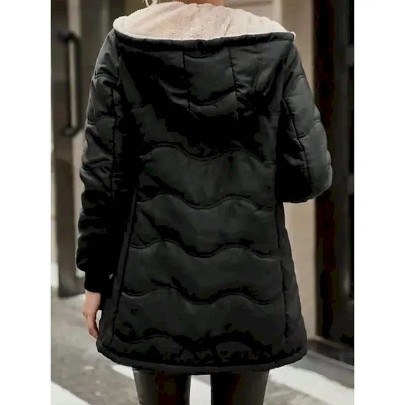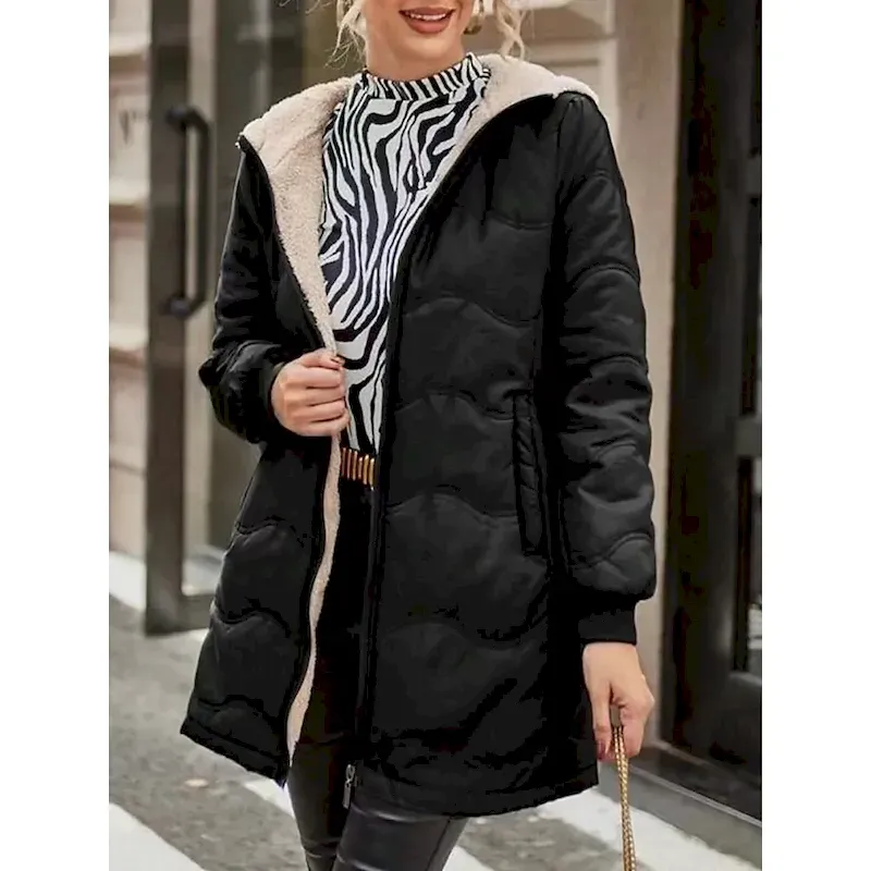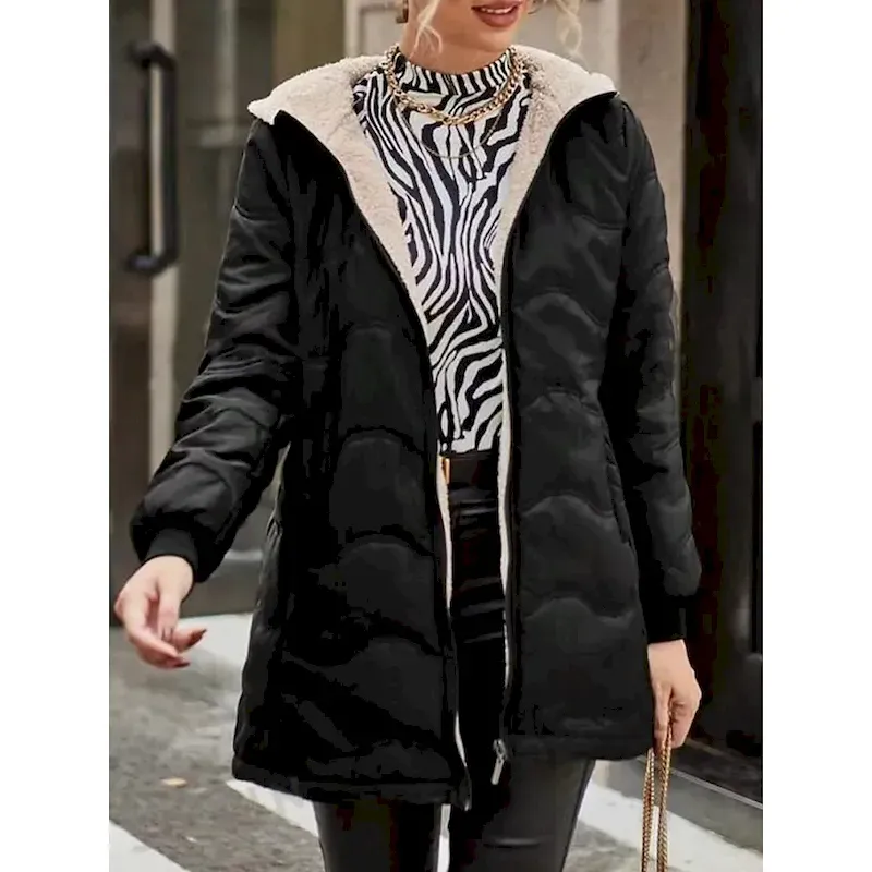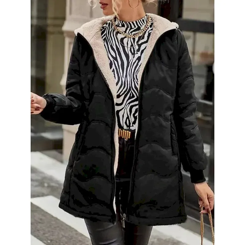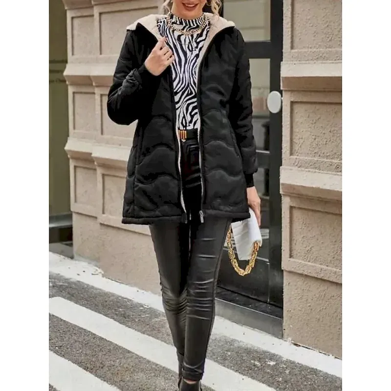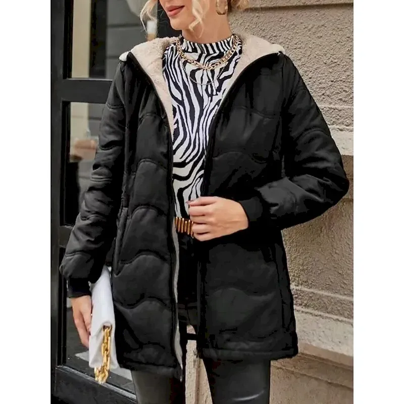 [Design Highlights] Key features include a full-length front zipper and a cozy, fleece-lined hood, offering both functional and fashionable elements. The jacket is equipped with practical side pockets and ribbed cuffs on the long sleeves to keep the cold air out, adding to the overall comfort and warmth. The plain pattern and sleek black color give it a modern urban vibe.