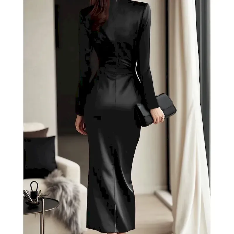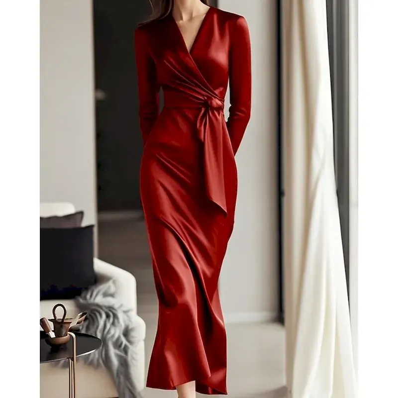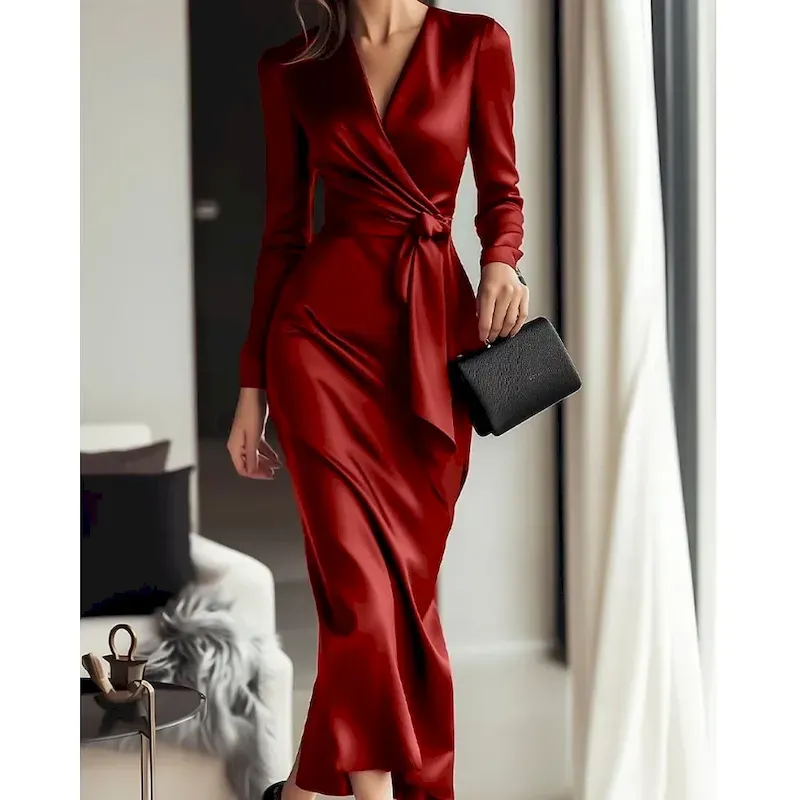 Women’s Midi Dress Party Dress Cocktail Dress Satin Dress Elegant Modern Party Evening Party Regular Fit Plain Long Sleeve V Neck Black Wine Fall Winter