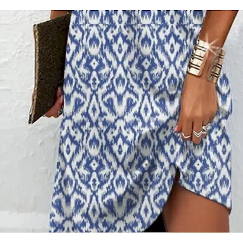 [Design Highlights]: The dress showcases an eye-catching blue and white ikat print and a sophisticated halter neckline, offering a modern twist on a classic style. A subtle asymmetrical wrap or slit at the hemline adds a touch of contemporary flair, enhancing its stylish appeal.