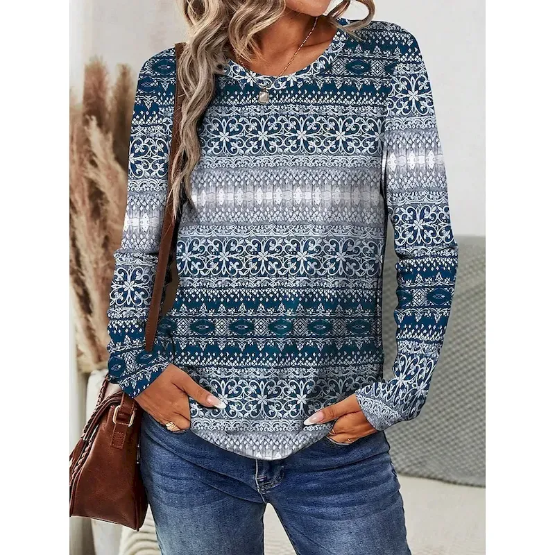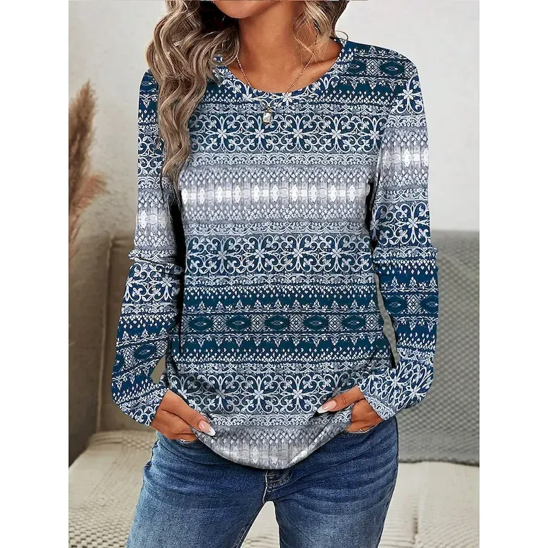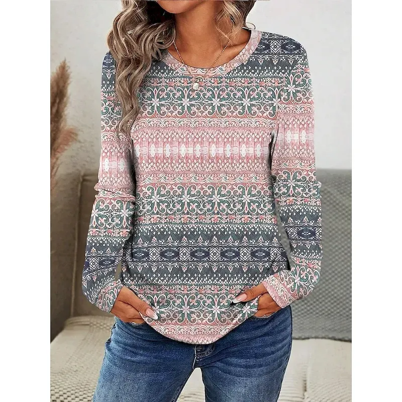 Women’s T shirt Long Sleeve Crew Neck Long Sleeve Tunic Graphic Geometric Stylish Casual Trendy Regular Tops Daily Weekend Print Pink Blue Fall Prefall