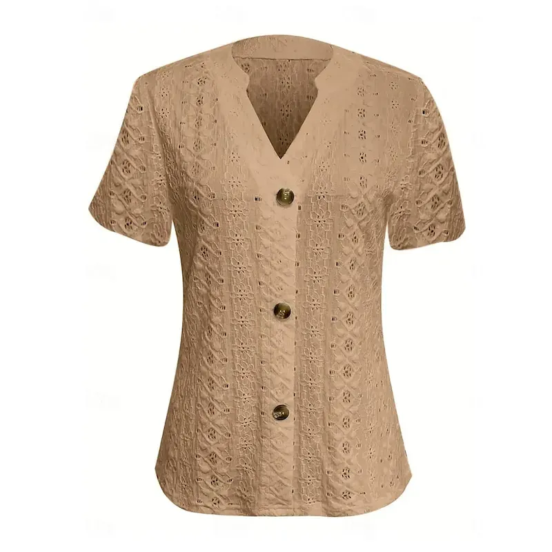 1.Gender: Women’s2.Design: Eyelet Buttons3.Occasion: Daily4.Style: Basic Casual5.Neckline: V Neck6.Sleeve Length: Short Sleeve7.Season: Summer